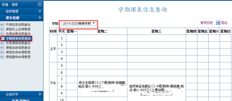 点击[培养]→[课务管理]→[学期课表信息查询]