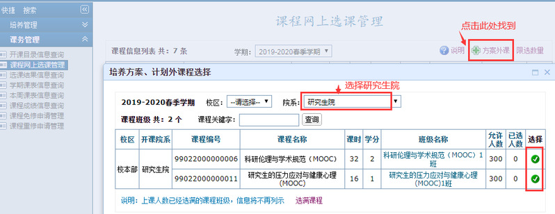 研究生慕课的选课:点击“方案外课”,找到“研究生院”开设的课程进行选择,示意图如下: