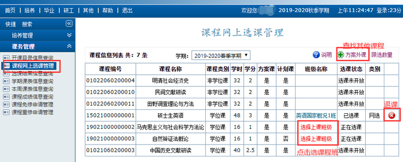 做好培养计划后,方可进行本学期的网上选课(注意:不做培养计划无法选课!)。根据已制定的培养计划,一些课程会自动显示,如未显示,请点击“方案外课”进行查找;点击“选择上课班级”进行设定,如要退出课程班级,请点击红色按钮退课(如下图所示)。如有多门课程的时间冲突,可调整培养计划。网上选课完成后,任课老师才能查看到已选课学生名单并于学期末录入课程成绩。