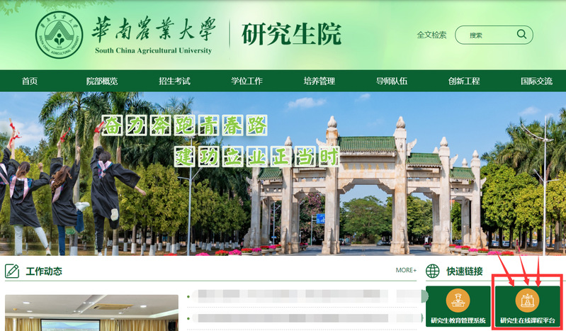第一种:请使用电脑登录华南农业大学研究生院官网,点击研究生院官网右下方的“研究生在线课程平台”(https://gsscau.yuketang.cn/pro/portal/home/)进行学习。(此为推荐方式)。示意图如下: